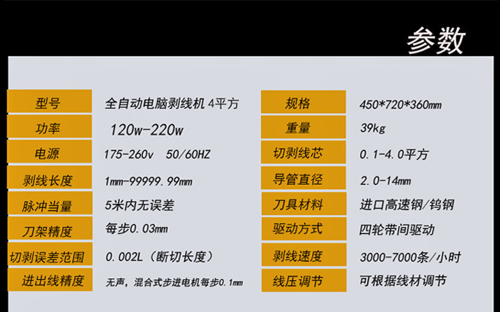 ![]() ![]() 二、型號(hào):全自動(dòng)電腦剝線機(jī) 13平方 規(guī)格:450*720*360 功率:120-220 重量:45KG 切剝芯線:01-13平方 導(dǎo)管直徑:2.0-14MM 刀具材料:進(jìn)口高速鋼/鎢鋼 驅(qū)動(dòng)方式:四輪帶間驅(qū)動(dòng) 剝線速度:3000-5000條/H 線壓調(diào)節(jié):可根據(jù)線材調(diào)節(jié) 電源:175-260V 50/60HZ 脈沖當(dāng)量:5米內(nèi)無(wú)誤差 刀架精度:每步0.03MM 切剝誤差范圍:0002L(切斷長(zhǎng)度) 進(jìn)出線精度:無(wú)聲,混合式步進(jìn)電機(jī)每步0.1MM 三、型號(hào):全自動(dòng)電腦剝線機(jī) 帶提輪16平方 規(guī)格:450*720*360 功率:120-220 重量:60KG 切剝芯線:01-16平方 導(dǎo)管直徑:2.0-16MM 刀具材料:進(jìn)口高速鋼/鎢鋼 驅(qū)動(dòng)方式:四輪帶間驅(qū)動(dòng) 剝線速度:3000-4000條/H 線壓調(diào)節(jié):可根據(jù)線材調(diào)節(jié) 電源:175-260V 50/60HZ 脈沖當(dāng)量:5米內(nèi)無(wú)誤差 刀架精度:每步0.03MM 切剝誤差范圍:0002L(切斷長(zhǎng)度) 進(jìn)出線精度:無(wú)聲,混合式步進(jìn)電機(jī)每步0.1MM